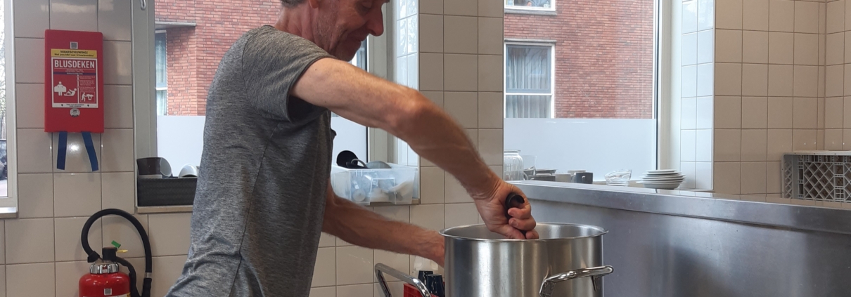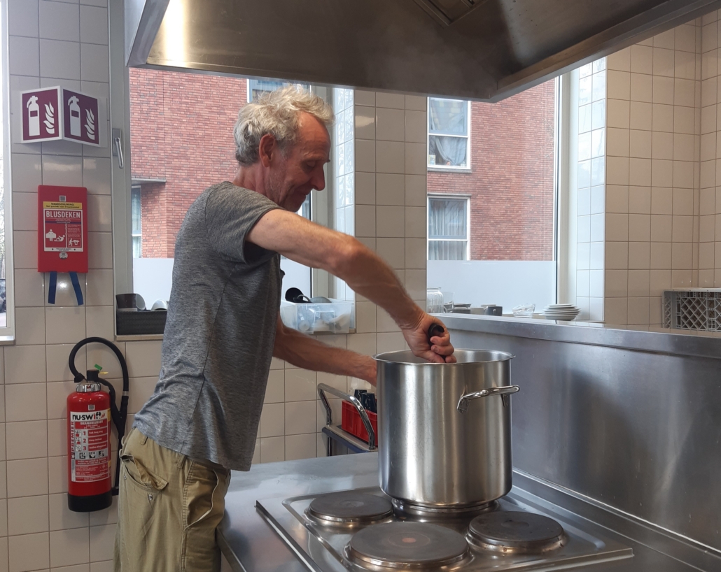 “Zelfgemaakte soep! Ik hou het meest van zelfgemaakte soep en dat is ook wat je nu ruikt. De soep van de Participatiekeuken die we normaal gebruiken is natuurlijk prima maar soms wel wat dunnetjes en omdat ik het heel leuk vind om zelf soep te maken en onze bezoekers ook een royaal gevulde soep boordevol vitamines en groente gun, kook ik graag zelf een soepje voor ze. In dit geval is de basis paprika en tomaat met natuurlijk wat extra ingrediënten (sinaasappeltje!) om het lekker op smaak te brengen. Zelf laat ik me graag leiden door het seizoen en vind ik een pittige pompoensoep heerlijk, maar ook een Franse uiensoep gaat er altijd in en als ik echt zin en tijd heb dan wordt het een bouillabaisse. Met een goede scheut pastis er doorheen. Heerlijk!”