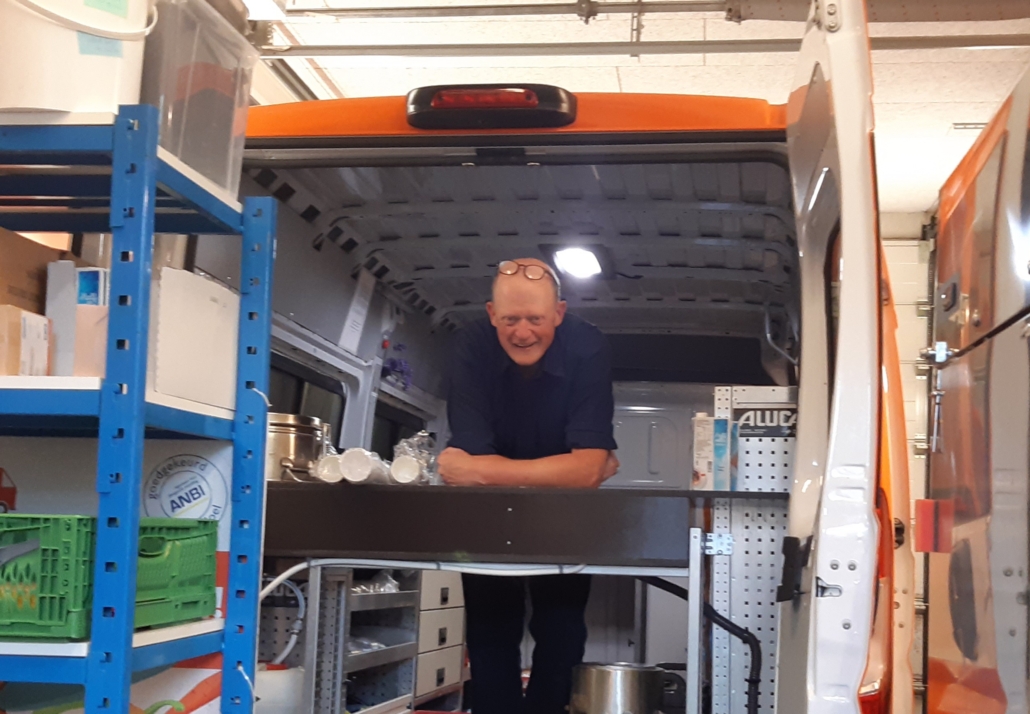 Peter begint ook te lachen. ‘Nou, het inladen van de Soepbus heb ik nog niet zo heel vaak gedaan want ik ben nog maar een klein jaar vrijwilliger maar het scheelt wel dat ik al ruim dertig jaar chef-kok ben en ook mijn eigen restaurants en een koksopleiding heb gehad. Bovendien heb ik het geluk en genoegen gehad om bij een aantal echt gerenommeerde chefs achter de kachel te mogen staan en dan leer je vanzelf efficiënt werken.” Ik besef me opeens dat ik me helemaal geen zorgen had hoeven maken. Peter draait hier inderdaad zijn hand niet voor om.